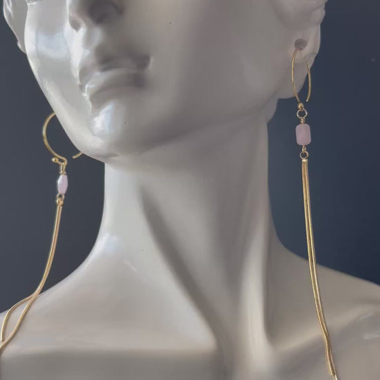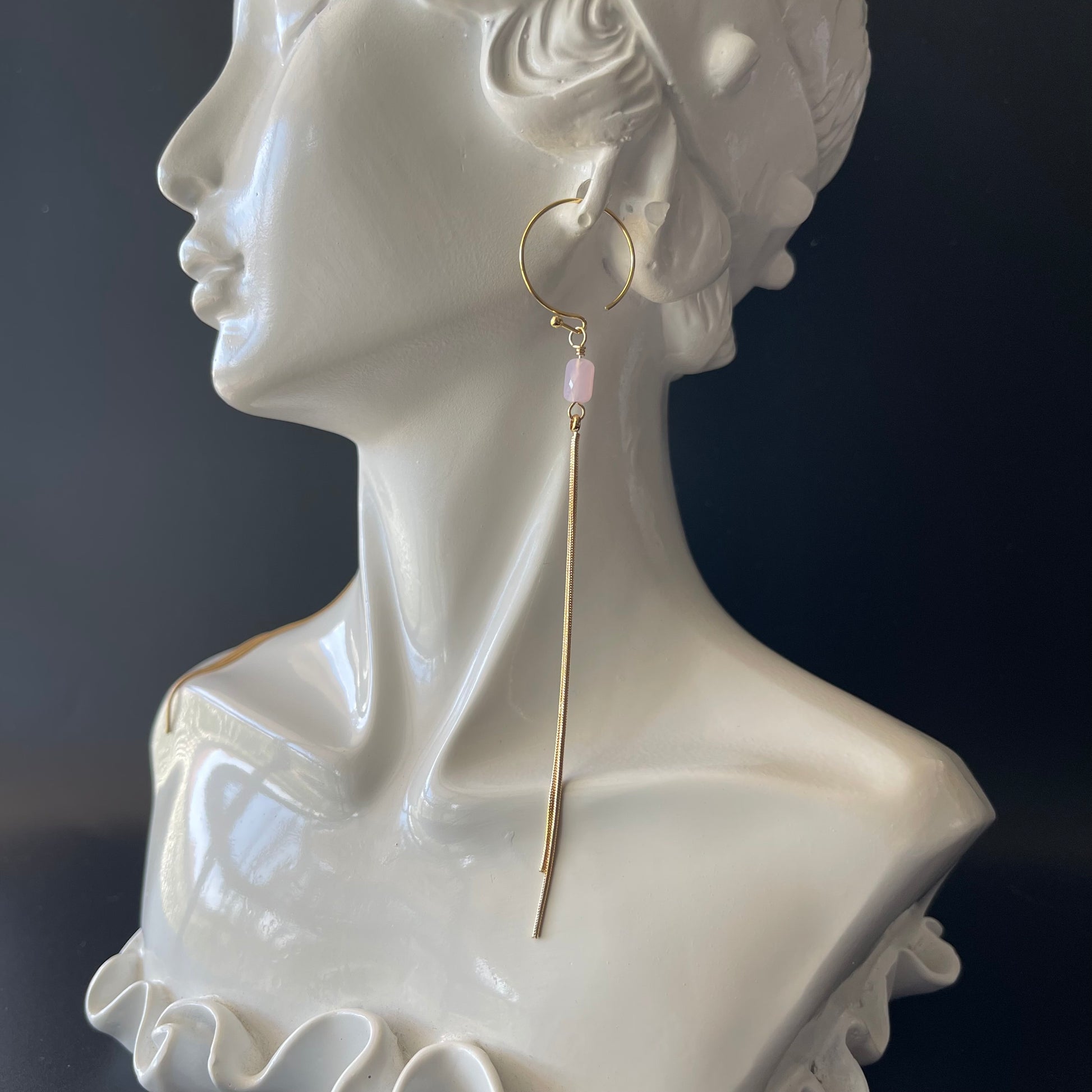 These dangle earrings feature warm gold tones beautifully paired with soft pink beads, creating a delicate and pretty accessory. Their elegant design adds a gentle sparkle, perfect for adding a feminine touch to any outfit.