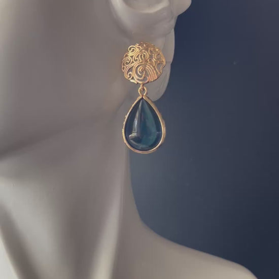 Drop Earrings in Champange Gold Colored Brass with Deep Blue Teardrop Shape Charm