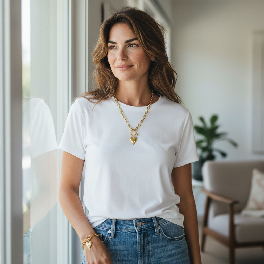 Gold Heart Pendant Necklace – 18" Stainless Steel Double Oval Chain with Toggle Clasp