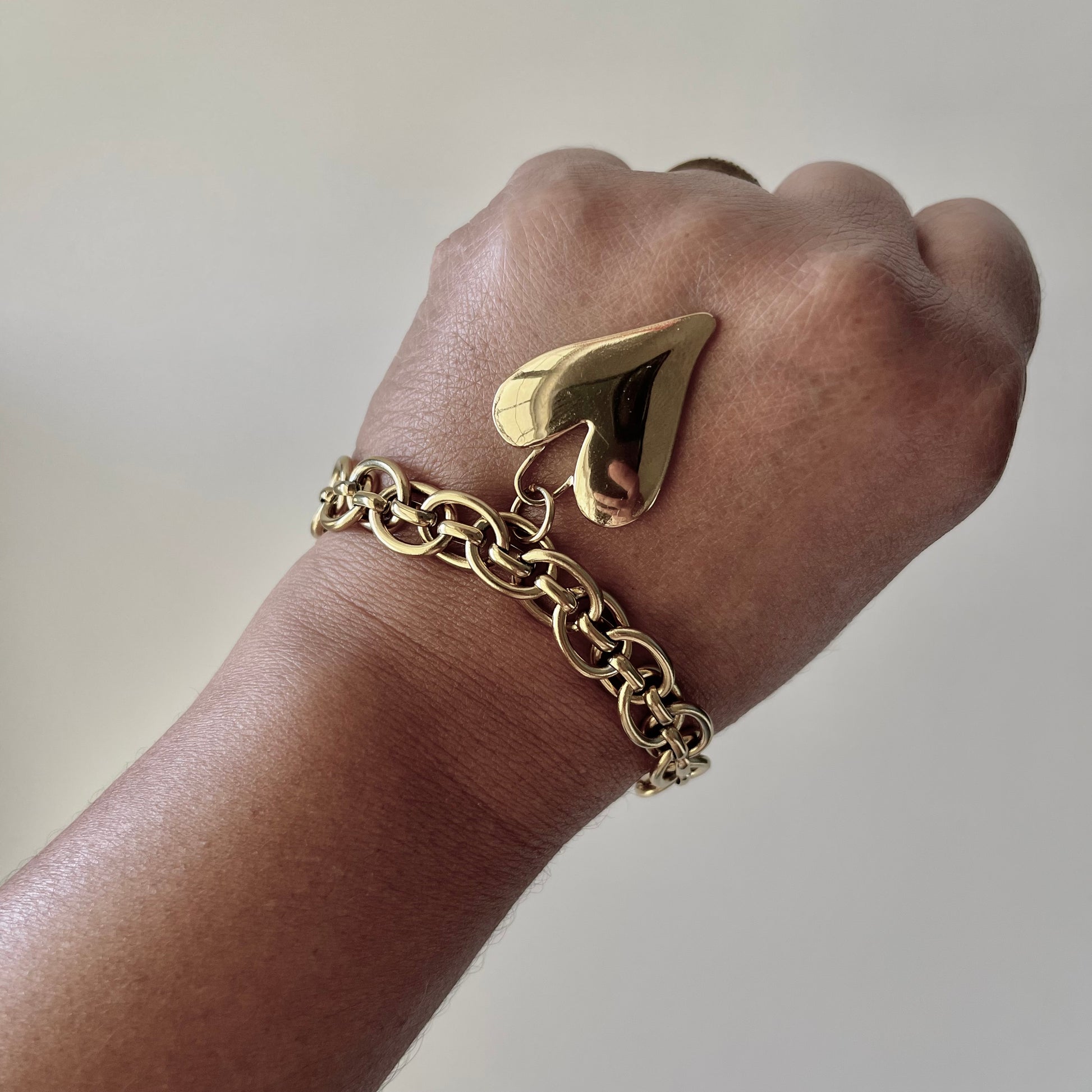 Elegant 7-inch gold stainless steel bracelet featuring a double oval textured chain and a shiny heart pendant. Tarnish-resistant and durable with a stylish toggle clasp—perfect for everyday wear or gifting.