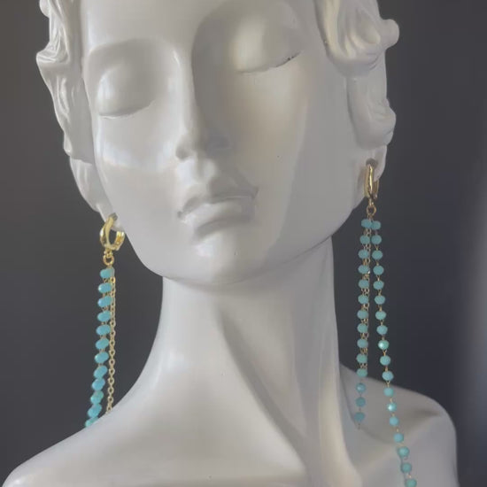 Make a bold yet elegant statement with these gold long drop earrings featuring delicate turquoise blue beads. Each pair is handcrafted with attention to detail, combining lightweight comfort with vibrant color and movement. The gold-plated hoops and cascading dual-chain design create a modern, eye-catching look perfect for both day and night.