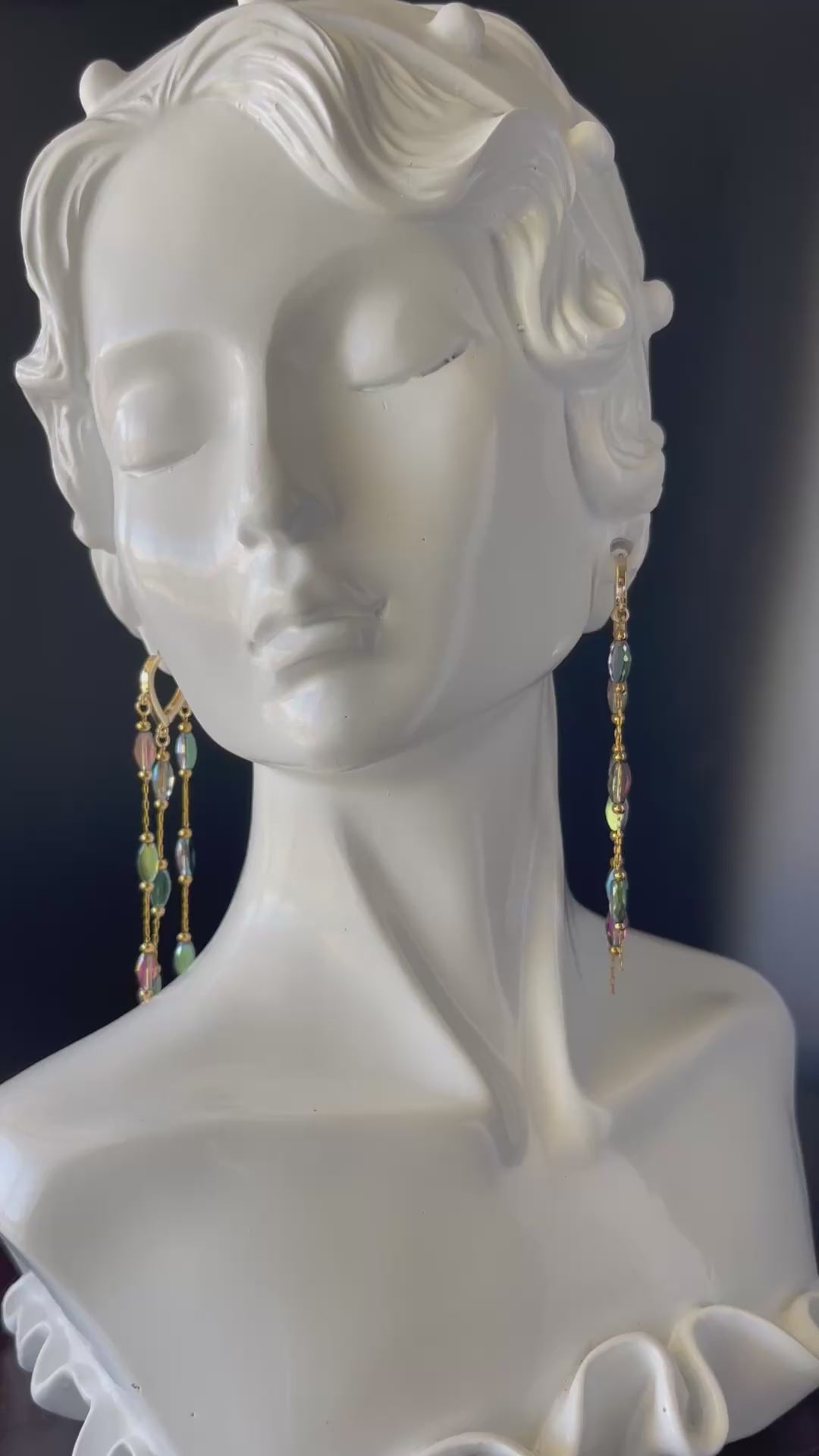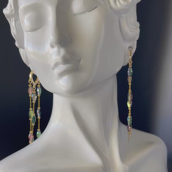 Discover the allure of these exquisite waterfall drop earrings, where gold elegance meets captivating color. Strands of white and peacock blue beads flow downward in a mesmerizing cascade, creating movement and dimension with every turn of your head. The harmonious blend of warm gold tones with cool jewel hues brings a sophisticated balance to your jewelry collection. Ideal for those who appreciate delicate craftsmanship and understated glamour, these earrings effortlessly elevate both casual and formal occasions with their enchanting beauty.