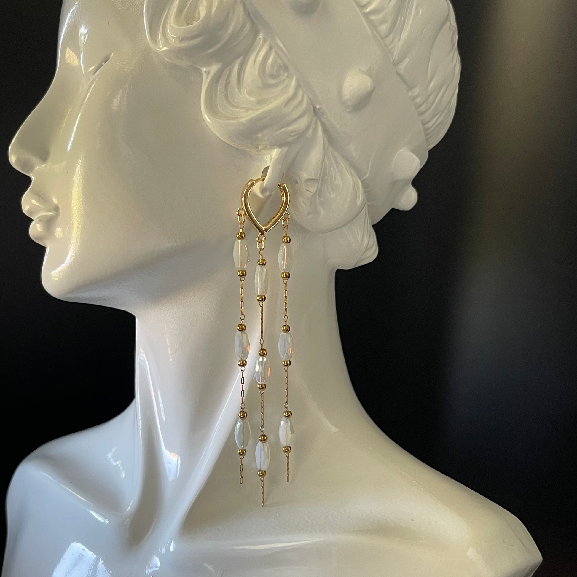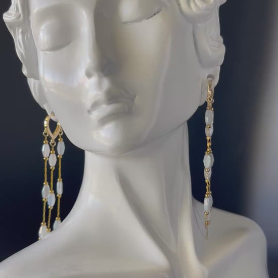 Gold Waterfall Earrings with White Crystal Beads – Timeless Statement Dangle Jewelry