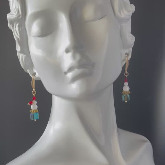 Handcrafted Snowman Christmas Earrings - Austrian Crystal Green Color Dangle Earrings with Gold Hooks