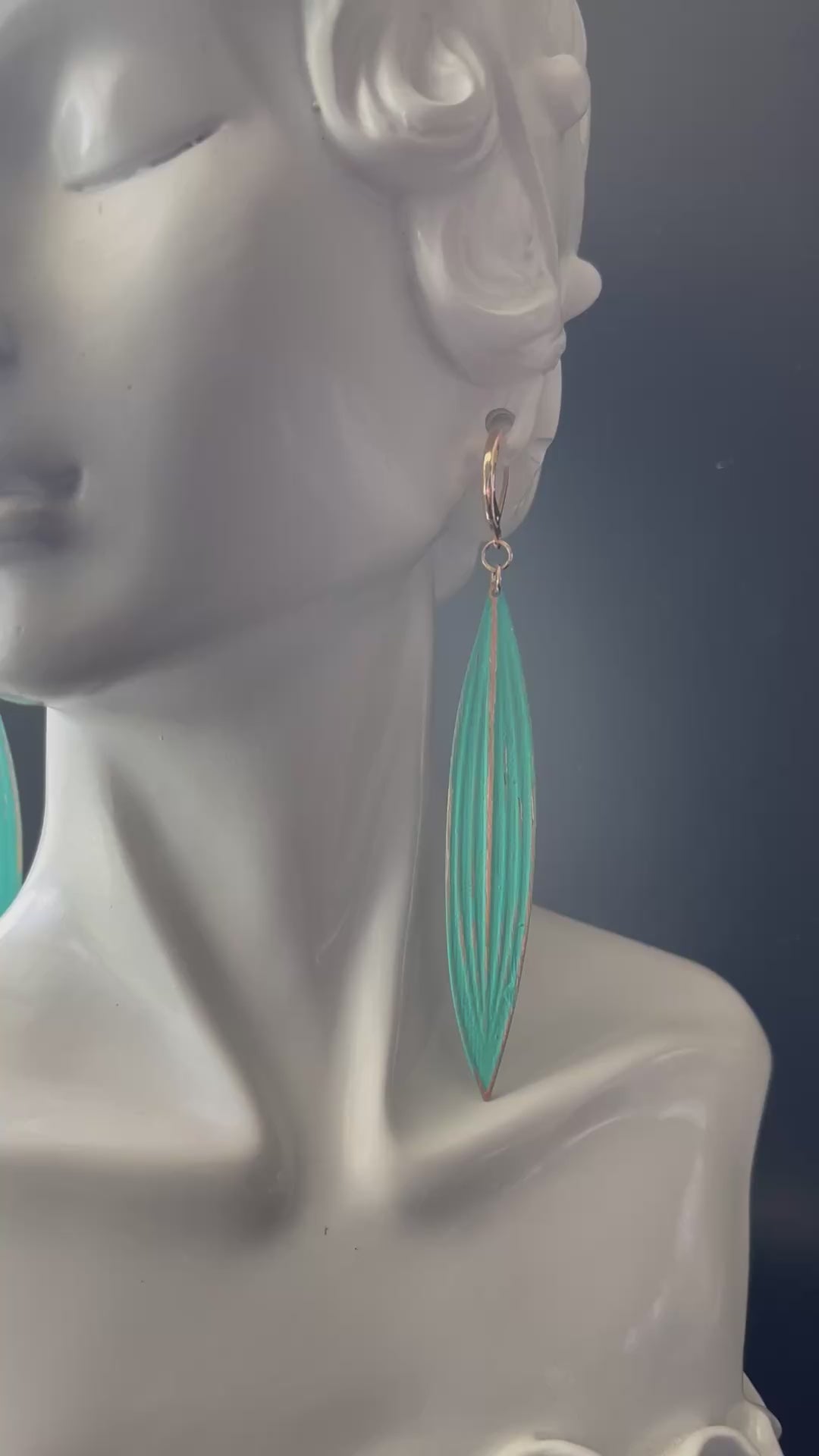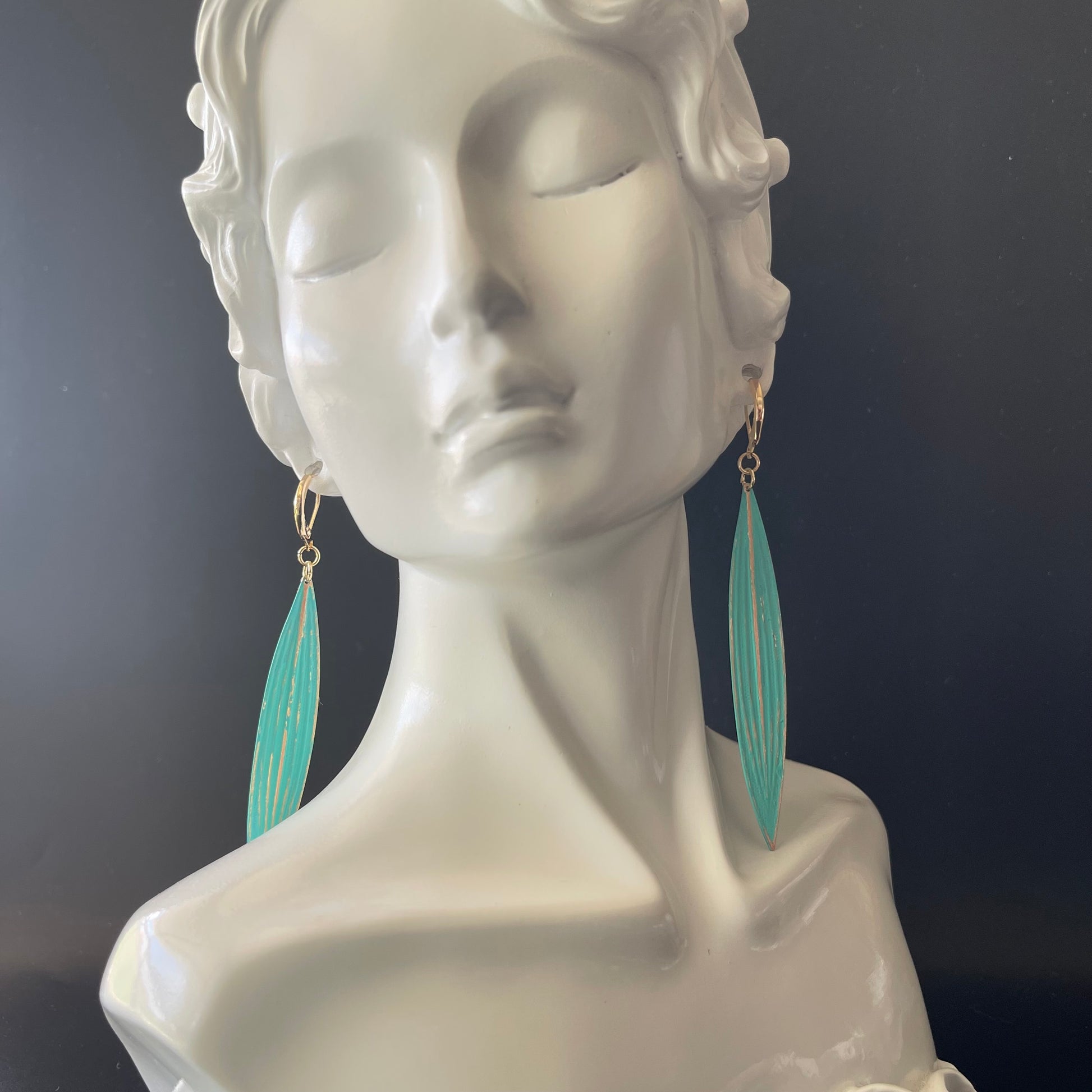 These pretty leaf-shaped earrings feature a vibrant teal design paired with gold color-plated brass clips. Their unique shape and rich colors add a fresh, elegant touch to any outfit, making them a charming accessory for both everyday wear and special occasions.