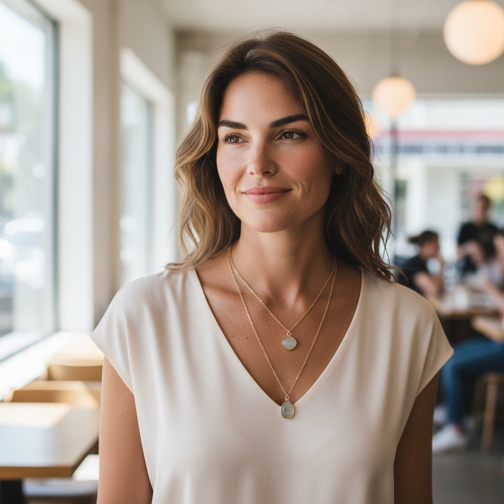 Add a touch of natural charm to your look with this adorable amazonite stone charm necklace! This sweet piece features a genuine amazonite pendant in soft, dreamy blue-green tones that's simply irresistible. Dangling from a delicate 24-inch chain finished in warm 14K gold plating, it's the perfect length for layering or wearing solo. Whether you're a crystal lover, nature enthusiast, or just someone who appreciates pretty things, this necklace is sure to become your new favorite go-to accessory. Cute, meaningful, and effortlessly stylish—what's not to love?