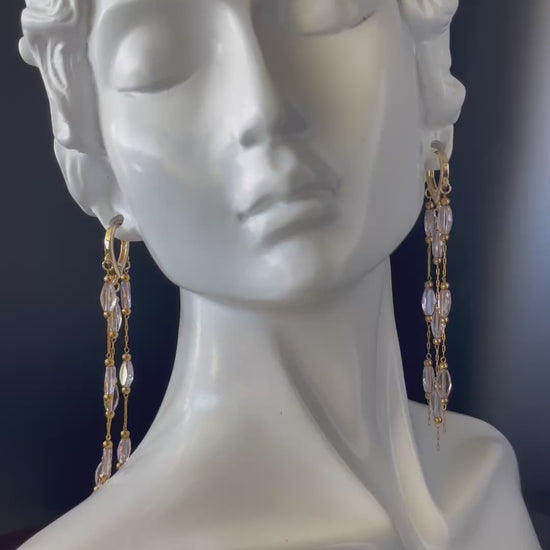 Gold Waterfall Earrings with Pink Crystal Beads – Romantic Statement Dangle Jewelry
